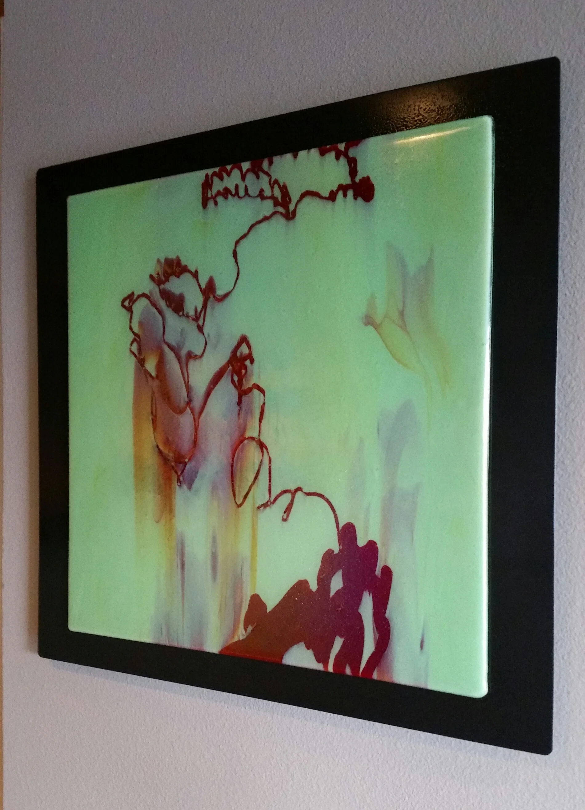 Garden of Tao 17.25"x17.25" fused glass, mounted on 21"x20" painted aluminum, 1" offset