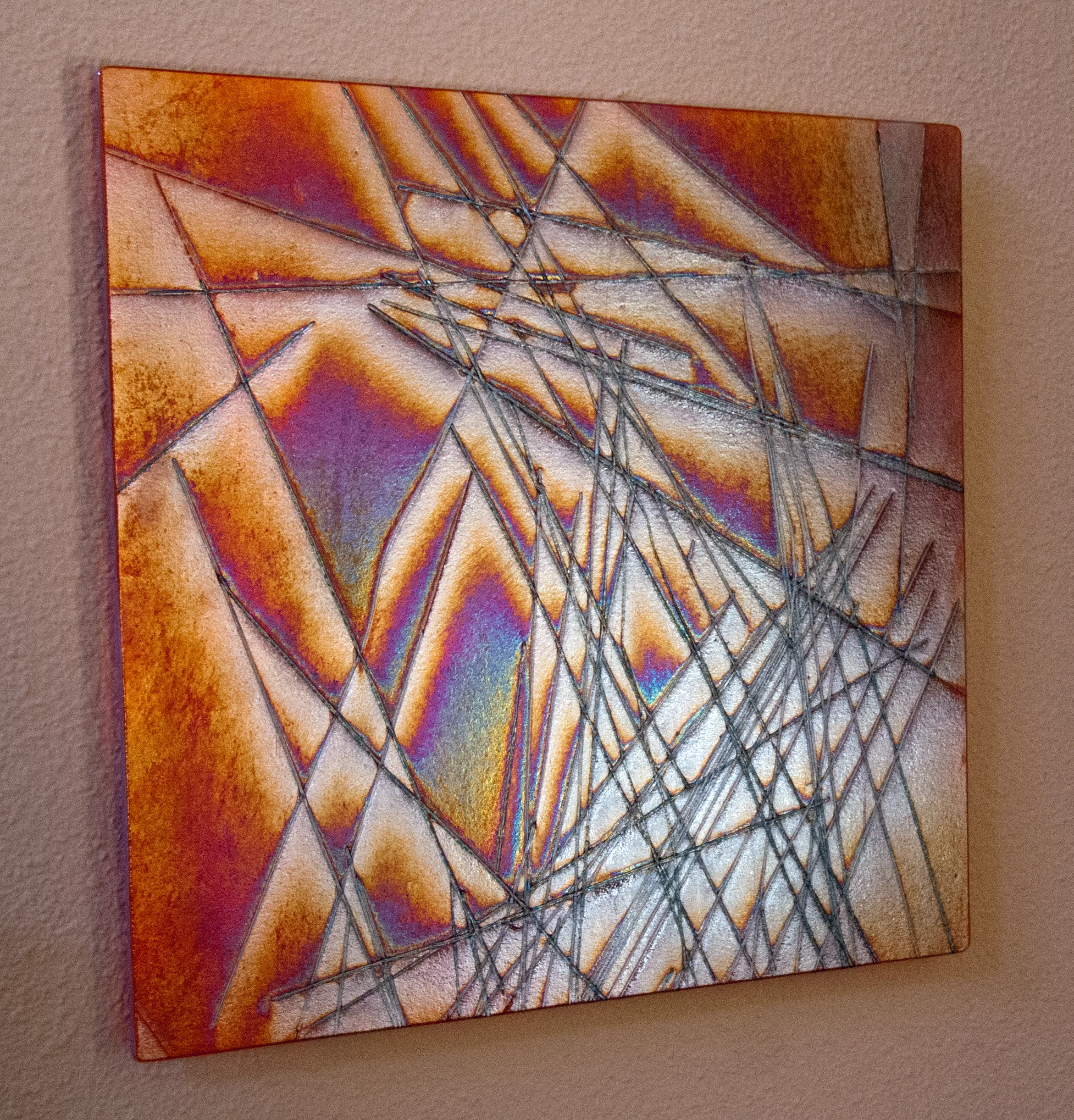 Chromatic Celebration 17.75"x21" fused glass with silver foil (mounted on 20"x23" brushed aluminum. 1.25" offset