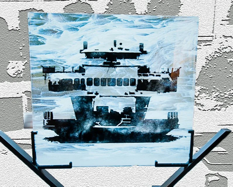 Mystic Ferry 17"x16" fused glass incorporating photograph of Washington State Ferry Sealth, taken by Chris Fox, Catalyst Photography NW.